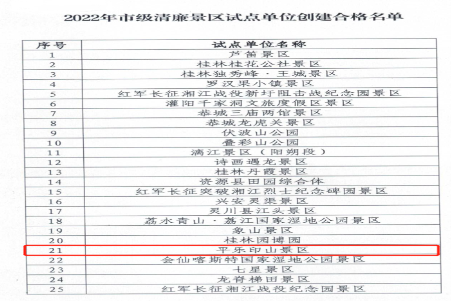 根据《桂林市清廉景区(试点、示范)评定实施办法(试行)》和《关于开展清廉景区评审暨绩效考评工作的通知》要求,平乐弘润公司印山旅游码头景区通过相关评定流程,成功入选2022年度市级清廉景区示范单位...