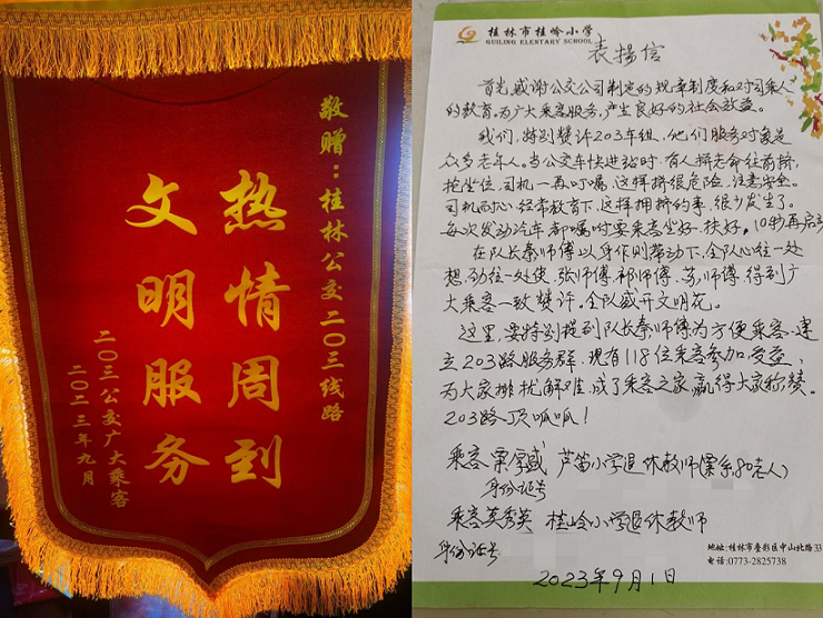 近日,退休教师莫阿姨同她的邻居粟阿姨一起来到桂林公交,把印有“热情周到,文明服务”字样的锦旗送到始发站场站安全服务部值班人员手上。莫阿姨、粟阿姨经常乘坐203路,她们说,203路司机对待每一位乘客...