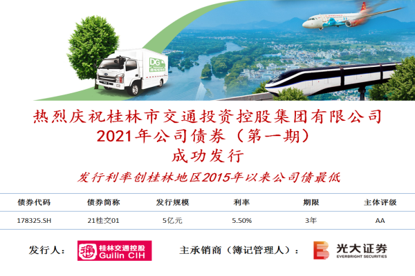 2021年4月9日,桂林交通控股集团成功发行2021年第一期5亿元公司债券,发行利率创桂林地区2015年以来公司债最低。