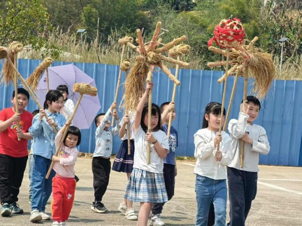 “一二三,举龙头!”在研学老师的指导下,孩子们手持亲手扎制的稻草龙,随着鼓点翩然起舞。草龙时而盘旋低伏,时而昂首腾跃,稚嫩的身影与古老的仪式交相辉映。8岁的轩轩骄傲地说:“老师说,草龙舞是古人祈求丰收的‘魔法’,今天我成了‘小魔法师’!”家长们纷纷举起手机,记录下这份跨越时空的文化共鸣。