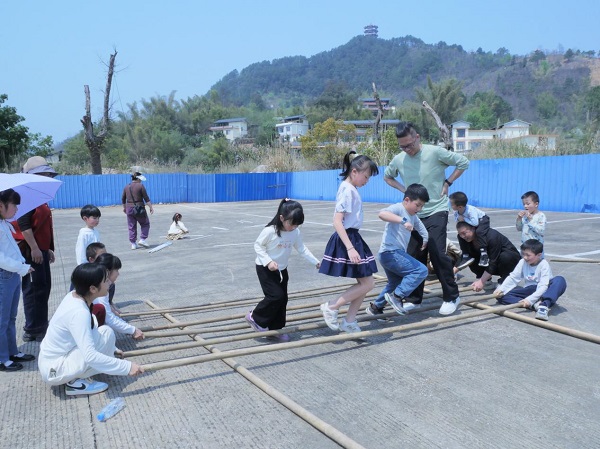 “开—合—跳!”清脆的竹竿敲击声与欢快的童谣交织成跃动的乐章。起初,孩子们在竹竿阵前踌躇不前,但在家长的牵手下,他们逐渐跟上节奏,灵巧穿梭于竹竿之间。笑声、掌声、呐喊声此起彼伏,10岁的朵朵擦着汗笑道:“就像解谜游戏,必须和伙伴们‘心有灵犀’才能成功!”这场舞蹈不仅考验协调能力,更让孩子们领悟了“同心同频”的深意。
