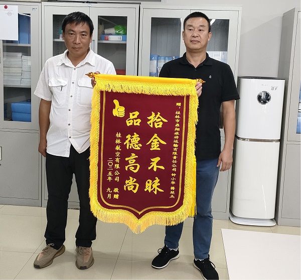 近日,桂林航空有限公司的代表将一面绣着“拾金不昧,品德高尚”的锦旗送到桂林投资集团鼎翔旅游公司。这面锦旗背后,是两位普通的通勤专线驾驶员用六年坚守书写的温暖故事——钟小华与蒋廷杰师傅,在平凡的十二米车厢里,以一次次“完璧归赵”的善举,为旅途注入诚信的温度。