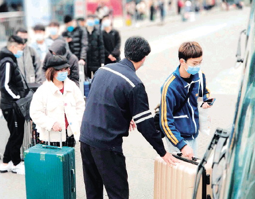 2月27日,桂林交通控股公交集团为了迎接各大院校学子返校,增开了电子科大花江校区、航院及雁山高校的返校定制专线。图为桂林北站现场,在工作人员的组织下,大学生们有序乘坐定制公交车返校。