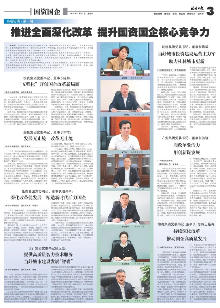 2025年是实施国企改革深化提升行动的收官之年。作为改革的践行者,国企的行动影响着桂林全面深化改革的成效。如何推动国企改革?新的一年,企业如何起好步、开好局?针对这些问题,近日本报记者采访了桂林七大国有集团公司及部分重点国企主要负责人。
