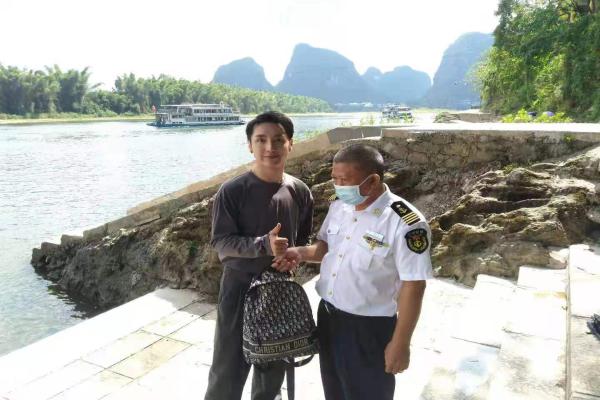 在阳朔龙头山码头,夏先生从船长黄基财手中接过背包、查看了包内的物品,无一丢失。夏先生竖起大拇指对黄基财说:“太感谢你们了,你们可真是品德高尚的人!”
