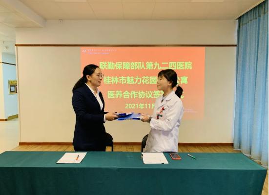 为促进医养结合发展,日前魅力花园(桂林交控)国际养老公寓与中国人民解放军联勤保障部队第九二四医院签订了《服务居民长期义诊活动协议书》,今后第九二四医院将为魅力花园养老公寓老年人开通就诊绿色通道,并不定期为魅力花园老人们开展慢病诊治、护理指导、重症转诊、疾病防控和宣教等专家惠民医疗服务。