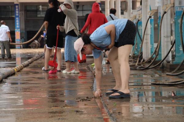 炎炎烈日下,大家边冲边扫,挥汗如雨。有的拿着铲子,一铲铲将淤泥和垃圾铲进垃圾车;有的拿着扫把站成一排,喊着号子,步伐一致地推着泥水;还有的没有工具,就徒手将排水沟中堵塞的落叶杂物捡出来;有的利用抽水机将维修槽里的积水抽出。经过一天的并肩奋战,在当天下午5点左右,铁西场站终于恢复了原貌。为公交线路全面恢复正常运营夯实了坚实的后勤基础。
