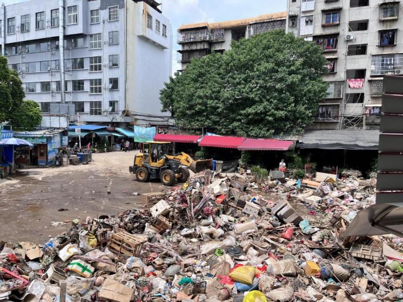 花鸟市场是桂林的老牌经营场所,市场分花、古玩、宠物三大区域,经营花卉、古玩百货、观赏鱼、宠物等,是一个休闲之地,平日淘货的市民络绎不绝。因受洪涝灾害影响,导致市场大量门面被淹,洪水退后垃圾堆积堵塞道路,严重影响正常经营,而且垃圾在太阳底下发出阵阵恶臭,极易滋生病菌。