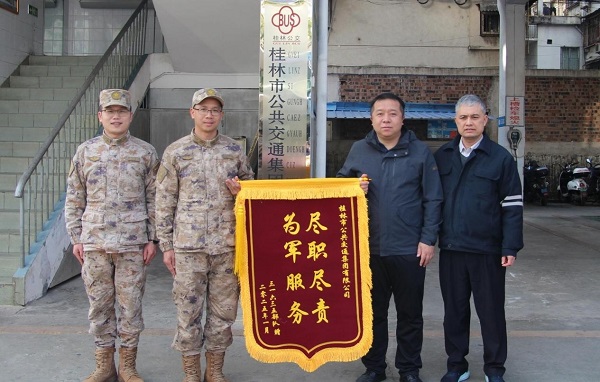 “专线开通后,我们官兵及家属的出行方便了很多,大家都想对公交公司表示感谢?!?025年1月14日,奇峰镇营区某部保障部官兵来到桂林公交,送来了一面写着“尽职尽责 为军服务”锦旗,感谢桂林公交为部队官兵提供了优质的出行保障服务。