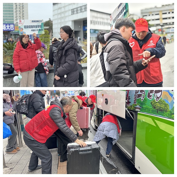 “从出站就看到醒目的引导牌了,还有志愿者一路帮我推箱子,真的被暖到了!”桂林电子科技大学学生小张这次返校行李特别多,从桂林站下来换乘公交时,他遇到桂林公交的志愿者一路提供帮助,直接送他上了返校的直达车,这让小张觉得特别暖心。据了解,为了做好春季学期高校定制专线服务工作,桂林公交提前谋划,一方面深入各高校详细了解开学时间安排与学生出行需求,与高校相关部门多次沟通协调,依据学生集中返校时间及购票程序显示的数据,精准预判乘车集中时段及人数情况,科学规划了花江、雁山、临桂三个方向的定制公交线路,最大限度满足不同区域学生的返校需求。另一方面,加强了返校集中时段公交主干线、交通枢纽、雁山片区、花江片区、临桂高校间的运力调配,重点增加5路、K96路等十余条线路的运力投入,全力保障学生出行顺畅。