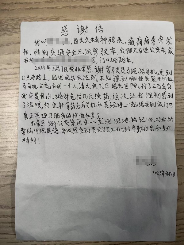 次日,获救乘客手写感谢信送至公交公司,信中动情写道:“在心里深深地铭记你对我的帮助!”。此事经现场群众口口相传,赢得广泛赞誉。桂林公交公司表示,马纯洁的举动正是企业“让服务与山水同美”理念的生动实践,未来将继续以暖心服务守护市民出行,为社会注入更多正能量。