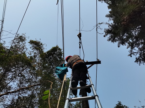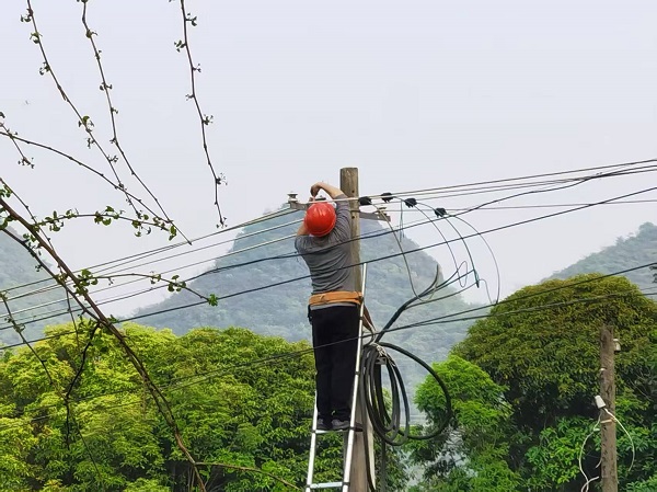 针对这一紧急情况,先锋队迅速制定“断竹清障+换线加固+绝缘升级”的抢修方案。抢修现场,队员们分工明确,配合默契,一场与时间赛跑的抢修攻坚战就此打响。清障组队员手持绝缘修剪工具,对变压器周边8米范围内的超高竹子进行专业砍伐,消除线路二次触碰风险;线路组队员争分夺秒更换100余米耐老化铜芯电缆,仔细地对断裂接点进行绝缘包裹与固定,并加装防树竹触碰的绝缘护套。