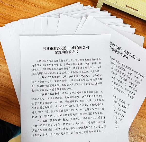 此外,鼎睿一卡通公司还组织全体党员干部签订了《家庭助廉承诺书》,要求每位员工不仅要在工作中严格遵守廉洁纪律,也要在家庭生活中树立良好家风,把廉洁自律意识融入日常生活中,积极营造清正廉洁的家庭氛围和良好的家教环境,共同守护家庭的幸福与安宁。